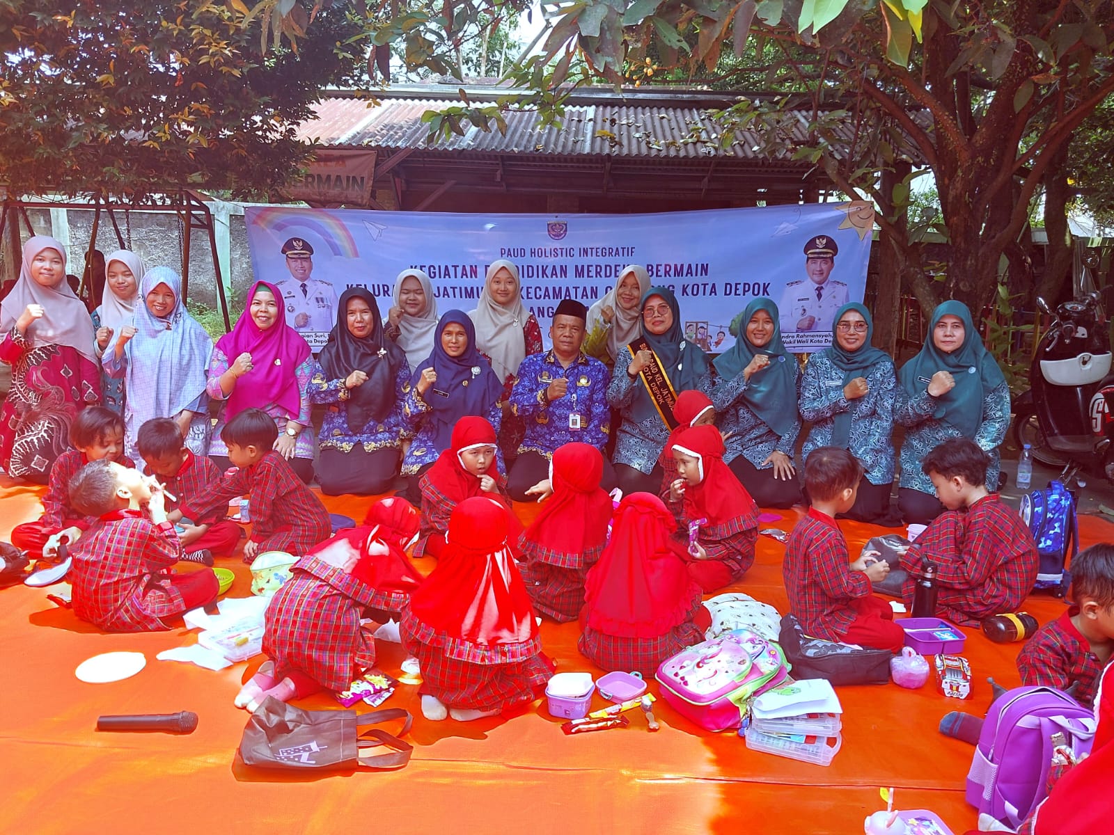 Puluhan anak tampak antusias mengikuti kegiatan Pendidikan Merdeka Bermain, bagian dari program PAUD Holistik Integratif (HI) yang digagas Pemerintah Kota (Pemkot) Depok melalui kolaborasi antara Kelurahan Jatimulya, Dinas Pendidikan, dan TP-PKK.