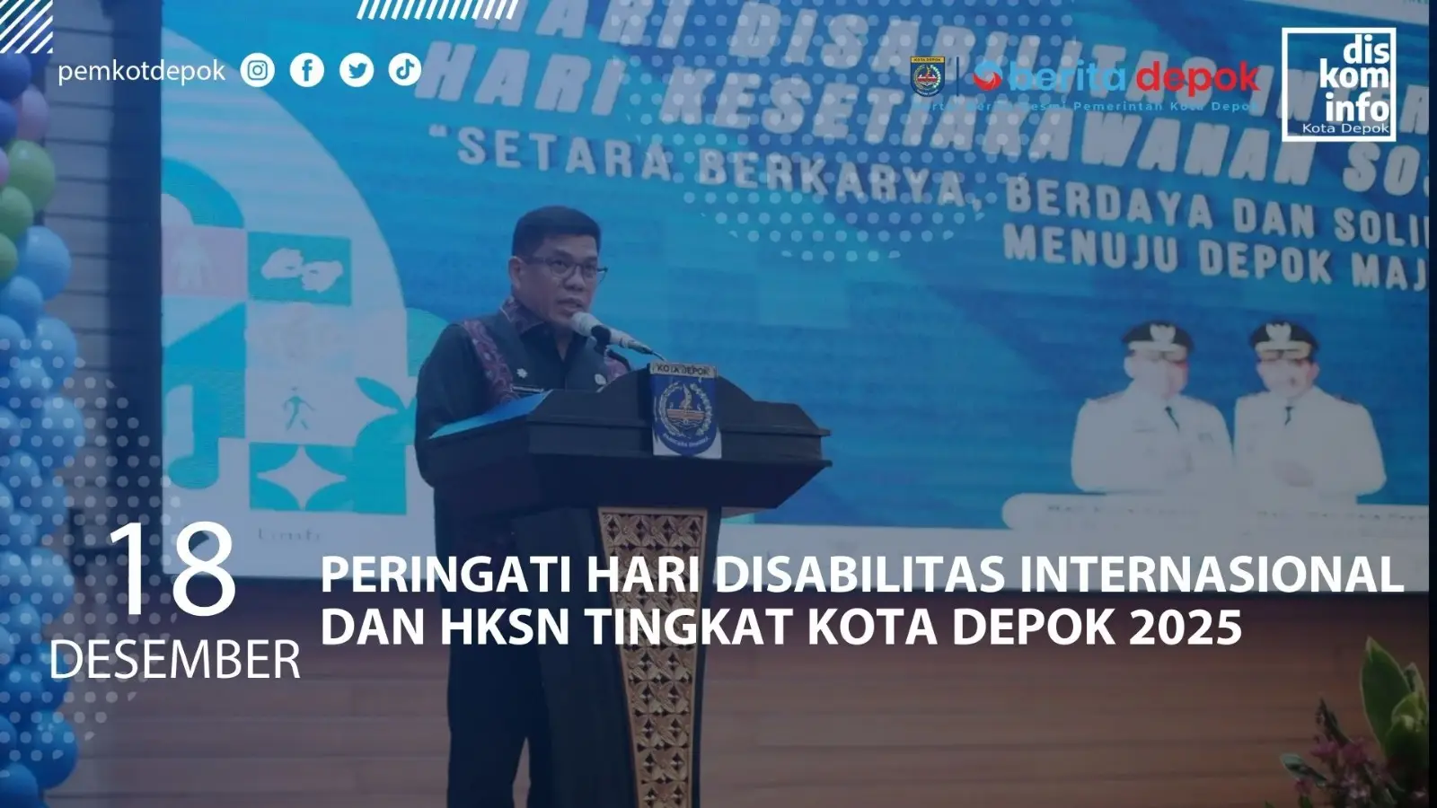 Pemerintah Kota Depok menggelar Peringatan Hari Disabilitas Internasional dan Hari Kesetiakawanan Sosial Nasional (HKSN) Tingkat Kota Depok Tahun 2025 di Aula Serba Guna Lantai 10, Gedung Dibaleka II, Kamis (18/12/25).
