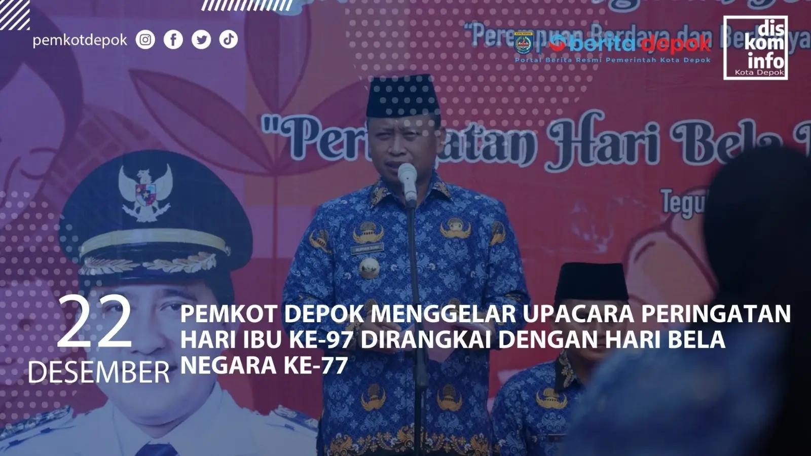 Pemerintah Kota Depok menggelar Upacara Peringatan Hari Ibu ke-97 dirangkai dengan Hari Bela Negara ke-77 di Halaman Balai Kota Depok, Senin (22/12/25).