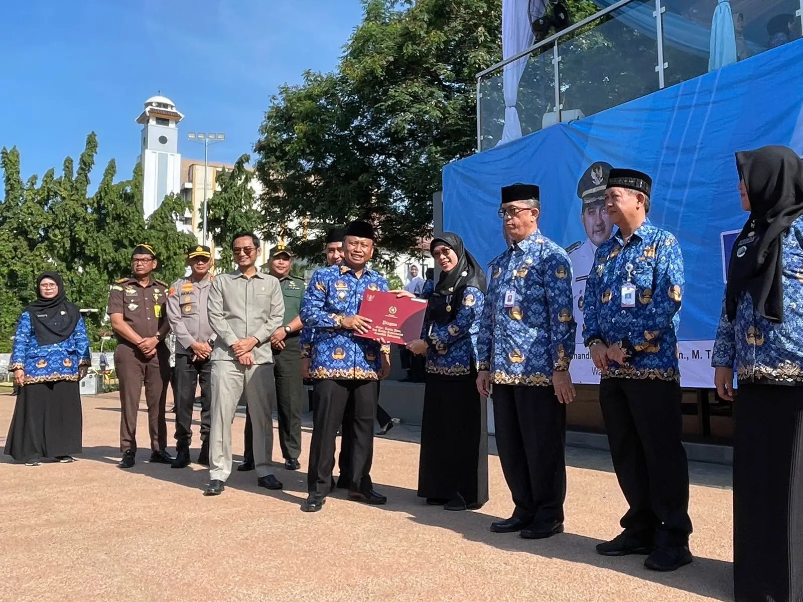 Wali Kota Depok, Supian Suri menyerahkan piagam dan piala penghargaan Peacemaker Justice Award tahun 2025 dan Anubhawa Sasana Jagaddhita dari Kementerian Hukum (Kemhum) Republik Indonesia (RI) kepada Lurah Depok Jaya, Herliana Maharani.